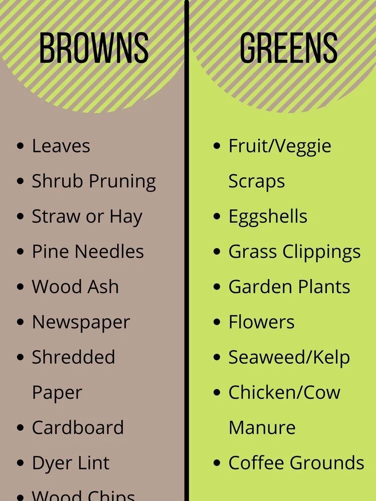 Greens - Grass clippings, fruit and veggie scraps, eggshells, coffee grounds
